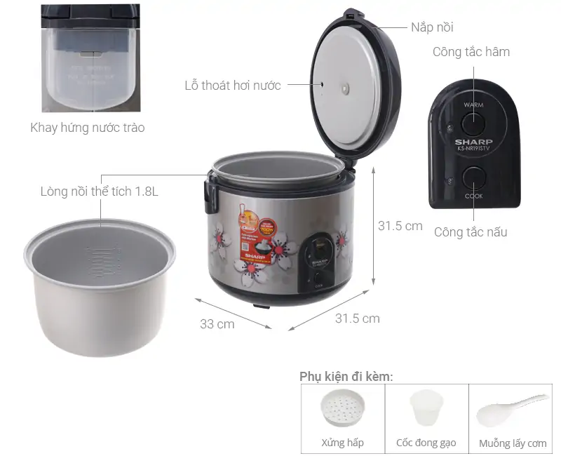 Sản phẩm còn có van thoát hơi tiện lợi, giúp giúp điều tiết lượng hơi nước trong nồi khi nấu, đảm bảo cho cơm không khô hay nhão bề mặt và bảo toàn lượng vitamin sẵn có trong gạo. Khi mua nồi cơm điện Sharp này, bạn sẽ nhận được bộ phụ kiện đi kèm bao gồm: xửng, cốc đong và vá cơm tiện lợi.