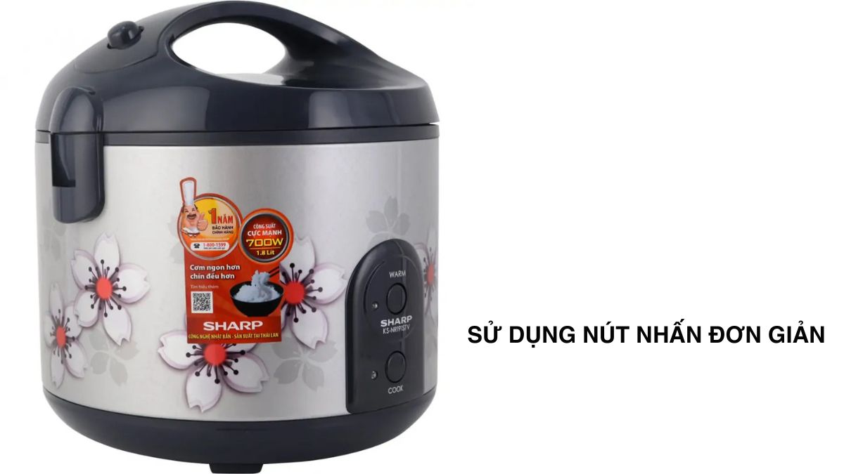 Người dùng có thể sử dụng nồi cơm điện Sharp này đơn giản, bằng cách nhấn nút trên thân nồi. Sản phẩm cung cấp 2 chế độ cơ bản, nấu cơm và hâm nóng tiện lợi.