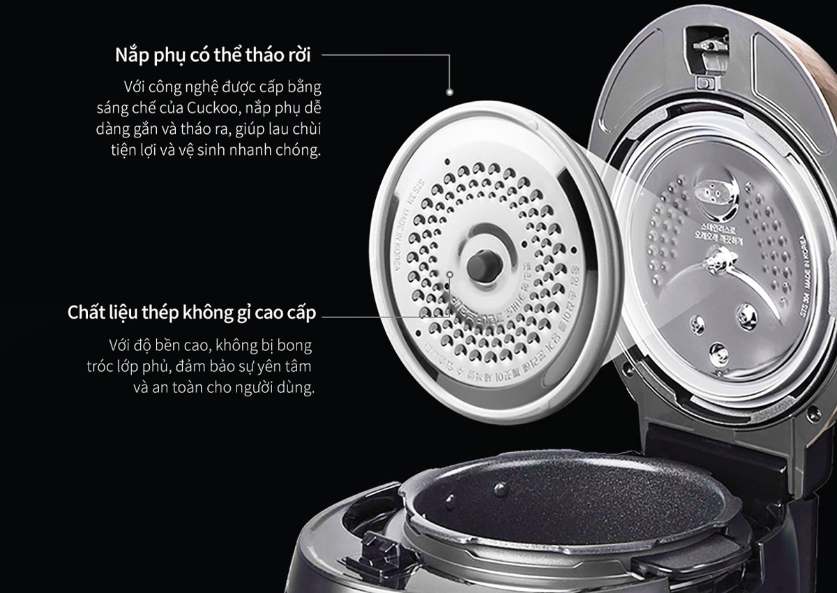 Bên cạnh đó, nắp trong và nắp phụ của nồi đều được làm từ chất liệu thép không gỉ cao cấp, bền bỉ và an toàn. Nắp phụ có thể tháo rời, giúp lau chùi và vệ sinh dễ dàng. Thiết bị có khay hứng nước thừa to, có khả năng chứa được nhiều lượng nước thừa. Khi mua sản phẩm, người dùng sẽ được nhận bộ phụ kiện muỗng cơm và cốc đong gạo.