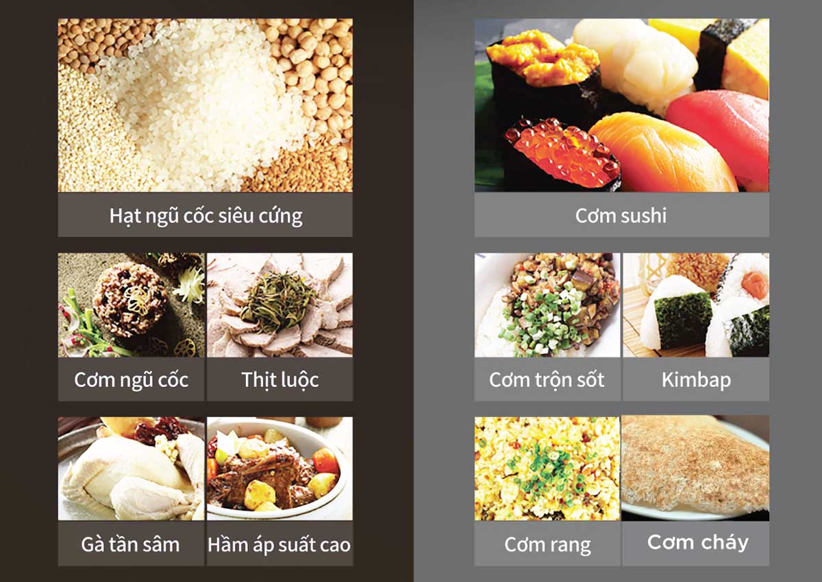 Sản phẩm được tích hợp 9 chức năng nấu khác nhau như: nấu cơm/gạo Gaba, nấu cháo, cơm cháy, hầm, xôi, ngũ cốc,… vô cùng tiện lợi. Người dùng có thể dễ dàng chế biến những món ăn ngon miệng và bổ dưỡng cho cả gia đình.