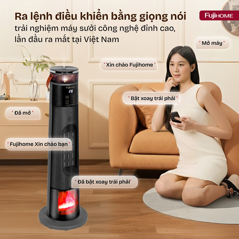 Điểm đặc biệt của Fujihome FH3303 nằm ở khả năng điều khiển bằng giọng nói tiếng Việt. Chỉ với một câu lệnh đơn giản, bạn có thể bật/tắt máy, điều chỉnh mức nhiệt hoặc thay đổi chế độ hoạt động mà không cần phải thao tác trực tiếp. Đây là tính năng cực kỳ tiện lợi cho người bận rộn, người lớn tuổi hoặc khi tay bạn đang ướt, đang nấu ăn hay bế trẻ nhỏ.