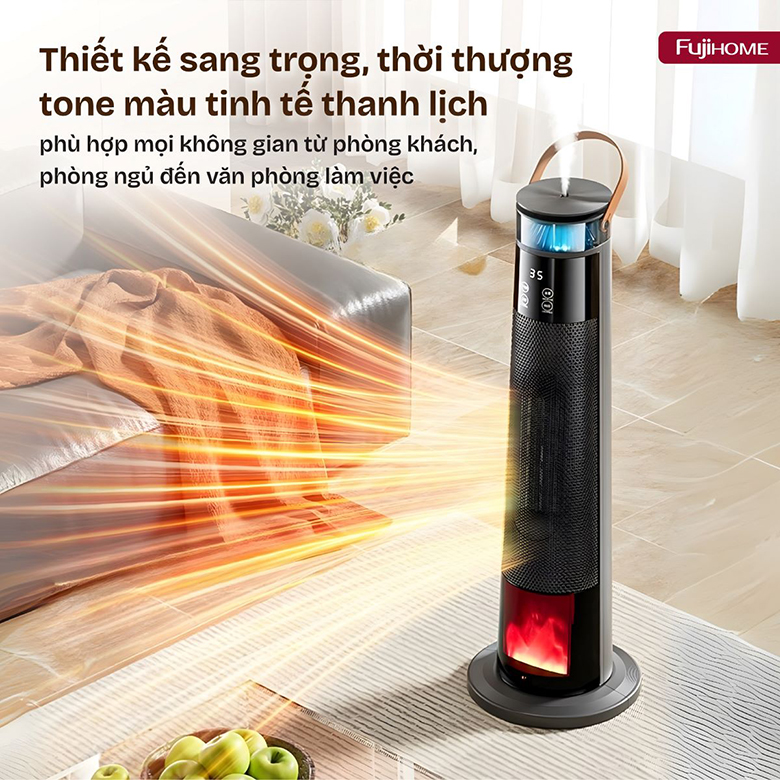 Với kích thước gọn nhẹ và trọng lượng chỉ khoảng 1,9kg, quạt sưởi gốm Fujihome FH3303 có thể dễ dàng di chuyển giữa các phòng. Kiểu dáng thon gọn, gam màu hiện đại giúp máy phù hợp với nhiều phong cách nội thất – từ phòng khách sang trọng đến phòng ngủ ấm cúng.