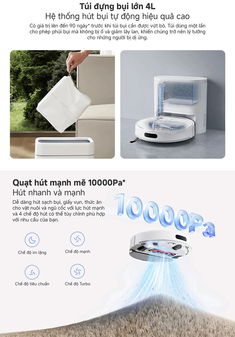 Túi đựng bụi của robot có dung tích lên đến 4 lít cho phép bạn sử dụng lên đến 90 ngày mà không cần đổ rác, tiết kiệm công sức và thời gian. Việc sử dụng túi đựng bụi dùng một lần cũng giúp giữ cho môi trường sạch sẽ và tránh bụi bẩn bị khuấy động trong không khí.