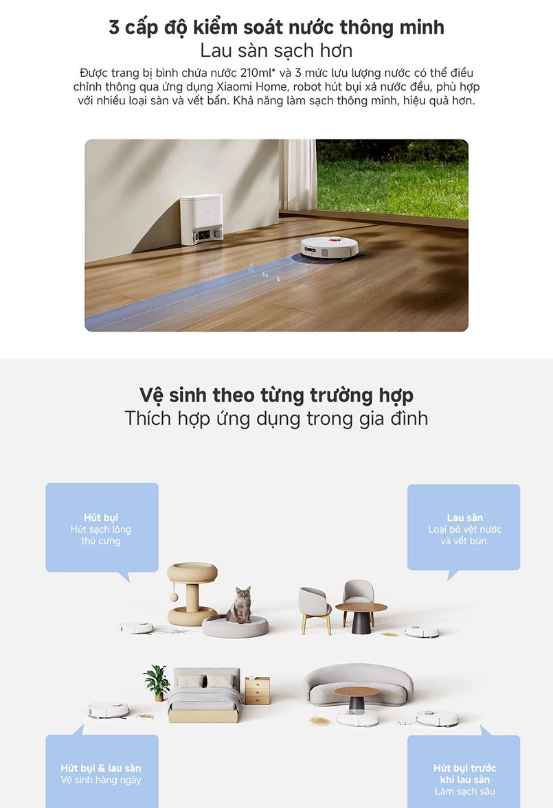 Việc điều chỉnh lượng nước đầu ra có thể thực hiện dễ dàng qua ứng dụng Xiaomi Home cho phép bạn lựa chọn mức nước phù hợp cho từng khu vực. Các chế độ nước này bao gồm mức nước thấp, trung bình và cao, phù hợp với nhiều loại sàn khác nhau như gỗ, gạch men, hay thảm.