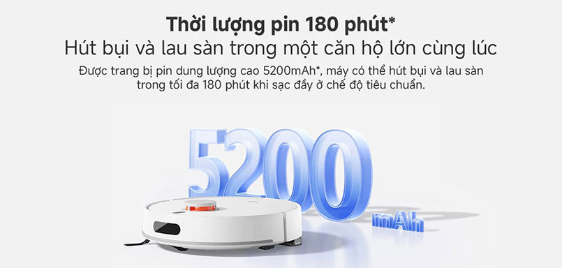 Robot hút bụi Xiaomi Vacuum H40 được trang bị pin dung lượng 5.200 mAh cho phép robot hoạt động liên tục trong khoảng 180 phút khi sử dụng ở chế độ tiêu chuẩn. Điều này đặc biệt hữu ích đối với những không gian rộng lớn như căn hộ, nhà có nhiều phòng, hoặc các khu vực cần làm sạch lâu dài mà không phải lo lắng về việc sạc lại pin giữa chừng. Thời gian hoạt động lâu dài giúp bạn tiết kiệm thời gian và giảm thiểu sự gián đoạn khi dọn dẹp.
