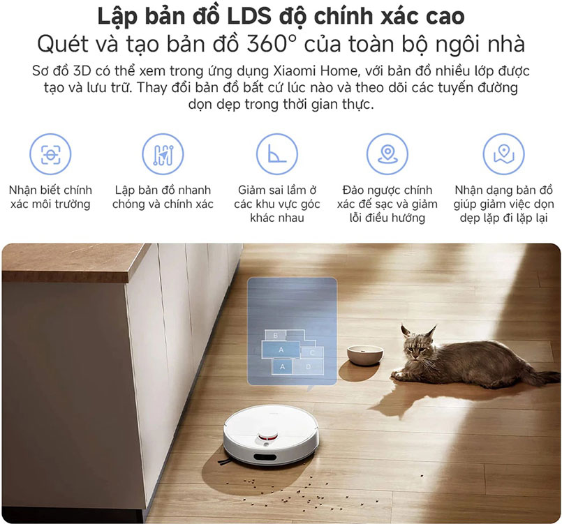 Bản đồ được tạo ra thông qua ứng dụng Xiaomi Home, nơi bạn có thể theo dõi tiến độ dọn dẹp theo thời gian thực. Hệ thống bản đồ này giúp robot không bỏ sót bất kỳ góc nào và có khả năng nhớ bản đồ của nhiều tầng, giúp dọn dẹp dễ dàng và chính xác hơn.