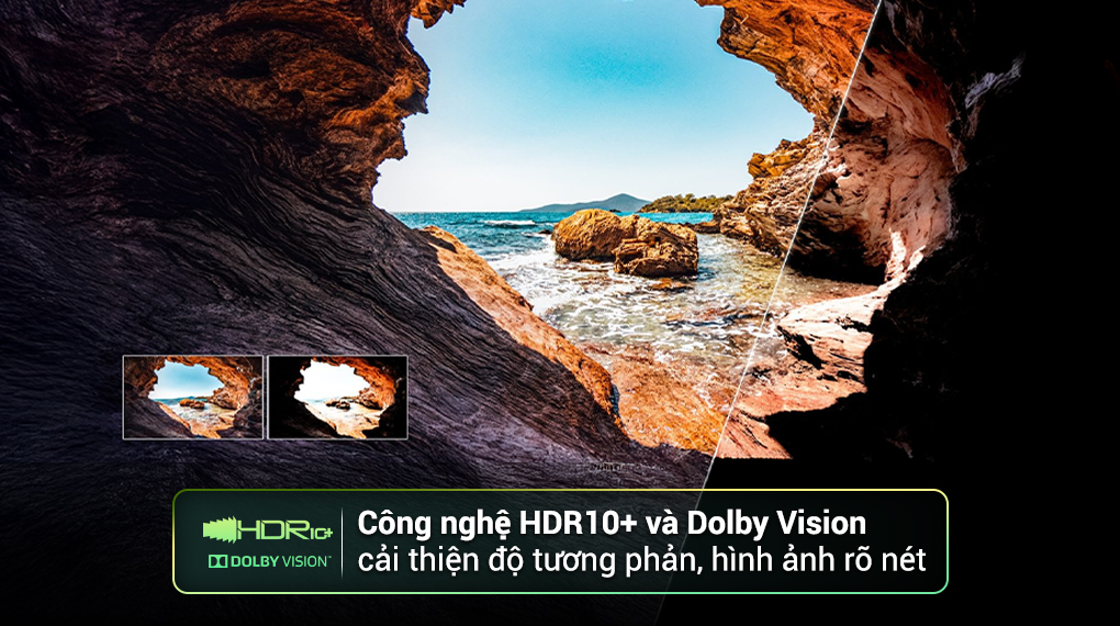 HDR10, HDR10+ và Dolby Vision tái tạo màu sắc rực rỡ, tăng cường độ tương phản, thể hiện vùng sáng – tối rõ nét. Nhờ đó, mỗi khung hình đều giữ được chi tiết trong cả cảnh tối lẫn cảnh sáng mạnh.