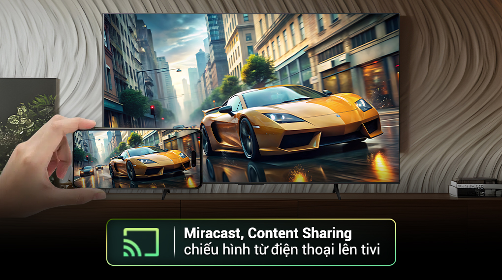 Chia sẻ nội dung từ điện thoại lên màn hình lớn qua AirPlay 2, DLNA, Miracast, Content Sharing.