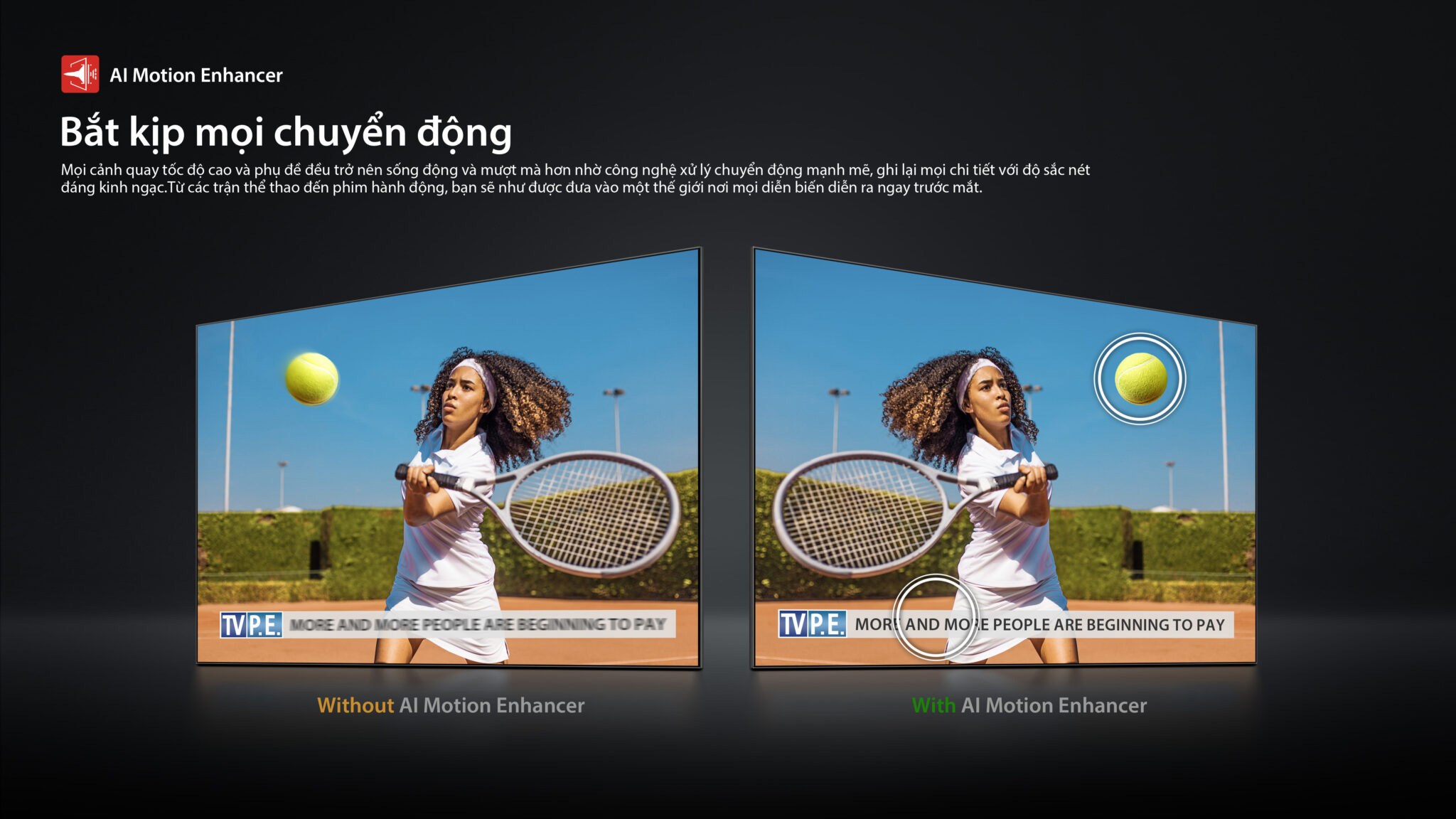AI Motion Enhancer giúp loại bỏ hiện tượng nhòe hoặc mờ hình trong các cảnh chuyển động nhanh. Tivi tự động phân tích và chèn khung hình phụ, mang đến trải nghiệm xem mượt mà cho các chương trình thể thao, phim hành động hoặc các cảnh quay tốc độ cao. Mọi chi tiết đều được tái hiện rõ nét, không còn giật lag hay xé hình.