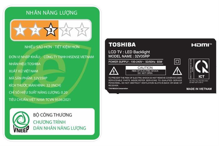 Toshiba 32V35RP có kiểu dáng gọn gàng, viền và chân đế bằng nhựa nên dễ bố trí trên kệ hoặc bàn tivi, phù hợp nhiều không gian sinh hoạt có diện tích hạn chế.