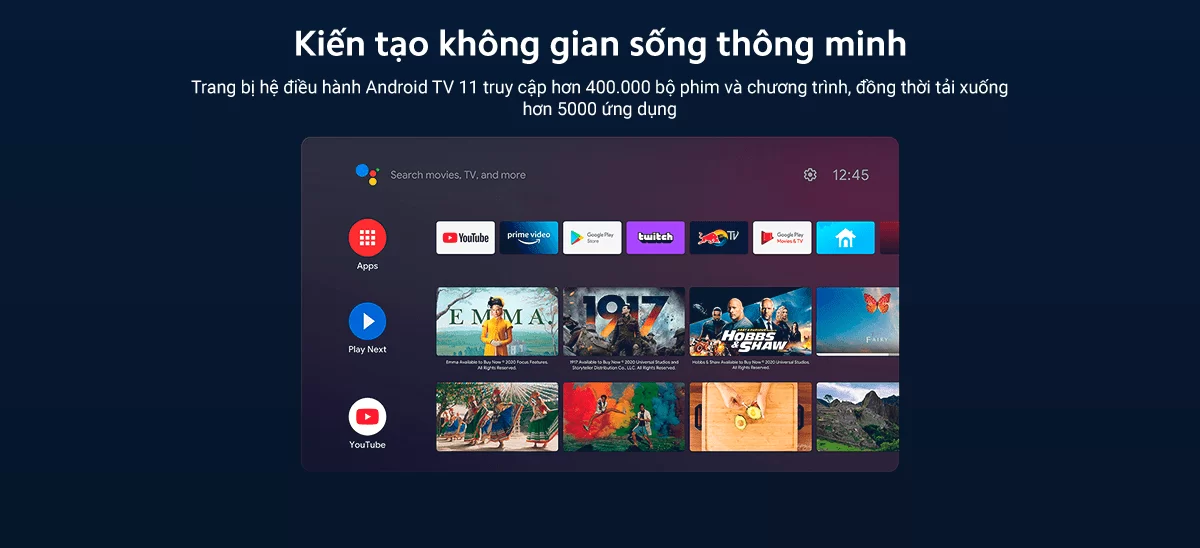 Với hệ thống Android TV™, người dùng có thể truy cập tức thì vào những bộ phim và chương trình trên Netflix, Prime Video, YouTube, cùng hàng nghìn ứng dụng khác qua Google Play.