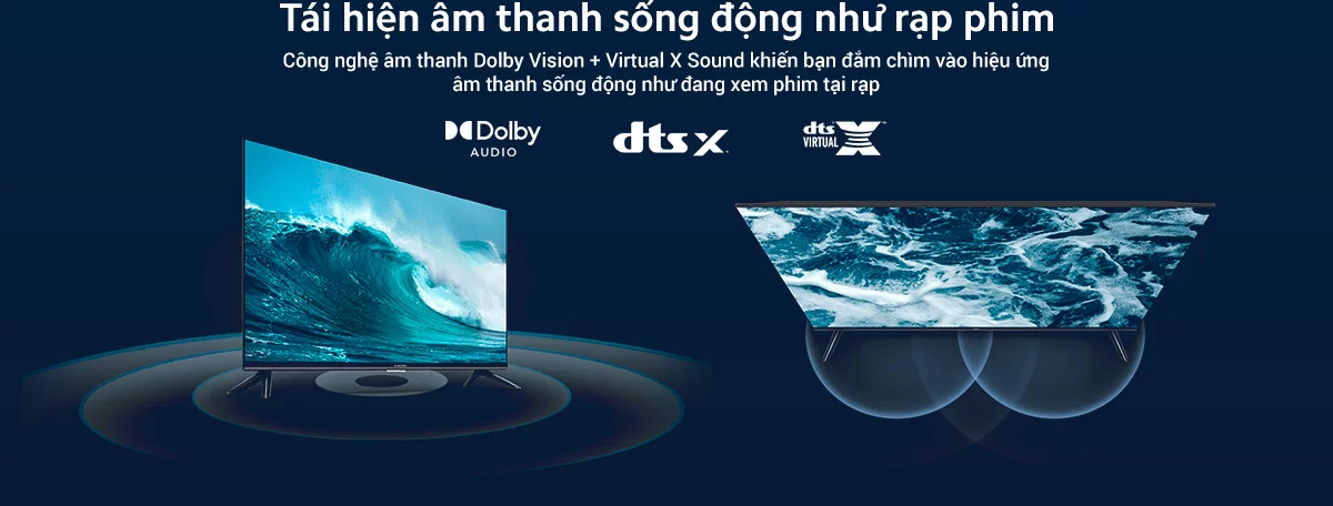 Bên cạnh đó, tivi xiaomi này trang bị âm thanh vòm đa chiều chất lượng cao từ Dolby Audio™ và DTS®Virtual:X.