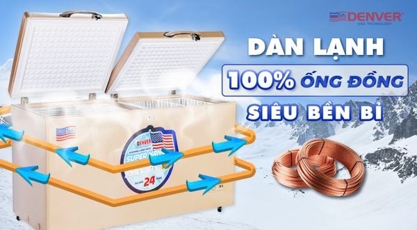 Tủ đông Denver trang bị dàn lạnh 100% ống đồng – một lựa chọn tối ưu mang lại hiệu suất làm lạnh vượt xa các dòng sản phẩm sử dụng chất liệu dàn nhôm hay sắt. Với khả năng dẫn nhiệt tuyệt vời (gấp đôi nhôm và hơn 5 lần sắt), dàn lạnh ống đồng giúp tủ đạt nhiệt độ lạnh sâu và đồng đều trong thời gian ngắn. Không chỉ vậy, chất liệu đồng còn nổi bật với độ bền vượt trội, chống ăn mòn hiệu quả trong môi trường ẩm ướt và nhiệt độ thấp, khắc phục hoàn toàn nhược điểm của nhôm dễ oxi hóa hay sắt nhanh gỉ sét.