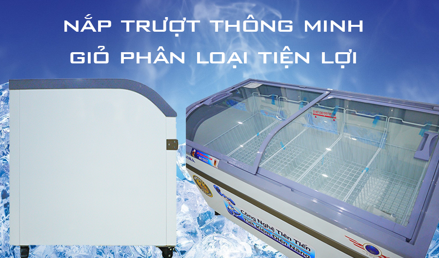 mở kiểu cửa lùa, có khóa an toàn giúp dễ dàng quan sát cho hoặc lấy thực phẩm trong tủ. Lòng tủ bằng nhôm phẳng lạnh nhanh, chống đóng tuyết tối đa.