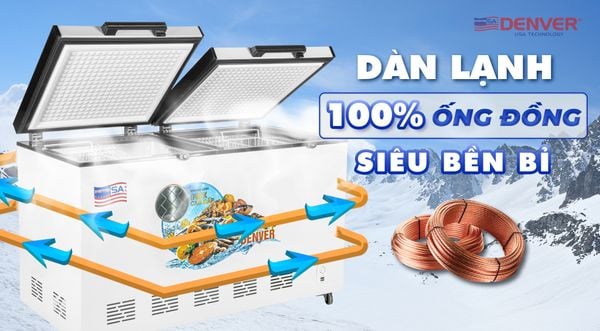 Tủ đông Denver trang bị dàn lạnh 100% ống đồng – một lựa chọn tối ưu mang lại hiệu suất làm lạnh vượt xa các dòng sản phẩm sử dụng chất liệu dàn nhôm hay sắt. Với khả năng dẫn nhiệt tuyệt vời (gấp đôi nhôm và hơn 5 lần sắt), dàn lạnh ống đồng giúp tủ đạt nhiệt độ lạnh sâu và đồng đều trong thời gian ngắn. Không chỉ vậy, chất liệu đồng còn nổi bật với độ bền vượt trội, chống ăn mòn hiệu quả trong môi trường ẩm ướt và nhiệt độ thấp, khắc phục hoàn toàn nhược điểm của nhôm dễ oxi hóa hay sắt nhanh gỉ sét.