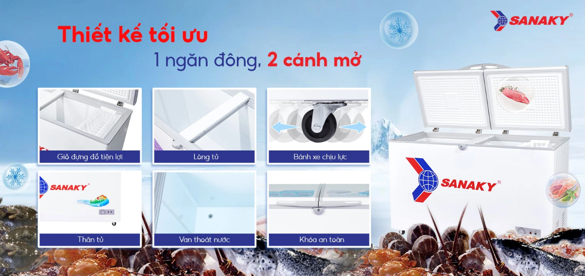 Tủ đông Sanaky VH-305A2 có thiết kế 1 ngăn đông và 2 cánh mở mang đến sự tiện lợi cho bạn trong việc tìm kiếm và sắp xếp thực phẩm trong tủ cũng như giảm bớt tình trạng hơi lạnh thoát ra ngoài gây tiêu hao điện năng.