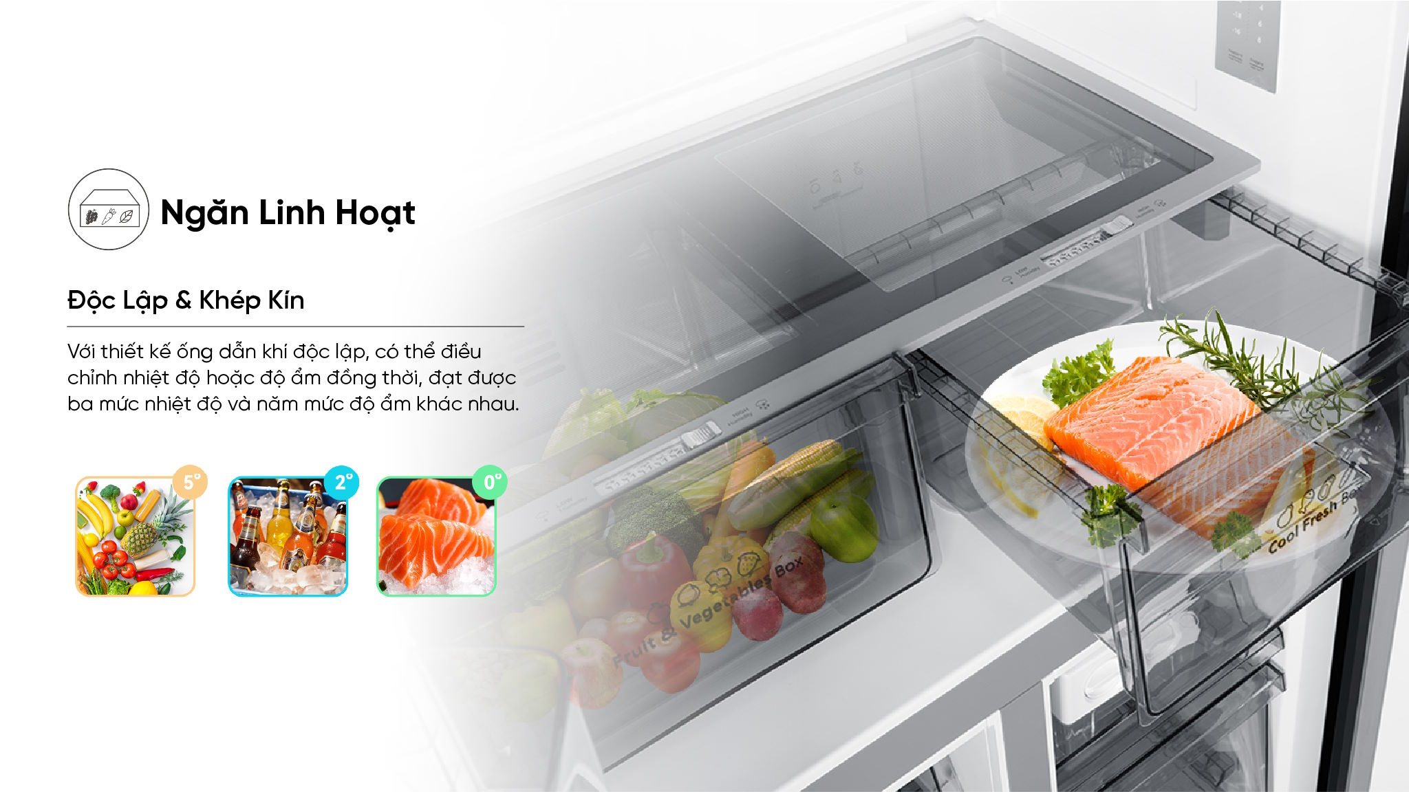 Ngăn linh hoạt và ngăn cân bằng ẩm – Bảo quản rau củ quả hoàn hảo