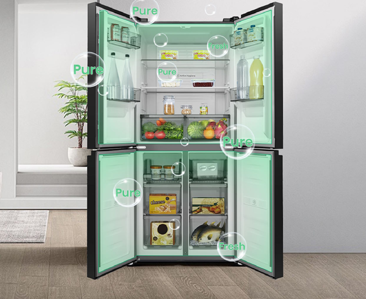 All Zone Active Hygiene với công nghệ CCA kháng khuẩn và khử mùi hiệu quả, giúp ngăn ngừa vi khuẩn gây hại và loại bỏ mùi khó chịu trong tủ lạnh và ngăn đông. Các module xúc tác từ xà phòng kim loại và tinh dầu thực vật phân hủy vi sinh vật và mùi hôi, đạt kháng khuẩn 99,99% và khử mùi 93,2%, mang lại môi trường bảo quản an toàn cho cả gia đình.