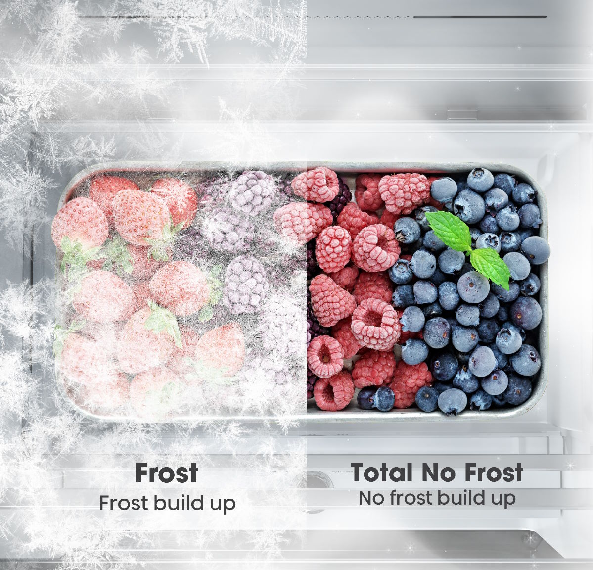 Công nghệ Total No Frost tiên tiến giúp luồng khí lạnh lưu thông đều khắp tủ, ngăn ngừa đóng tuyết và loại bỏ việc xả đông thủ công. Bạn sẽ luôn có không gian lưu trữ sạch sẽ, thực phẩm tươi ngon mà không mất thời gian bảo trì.