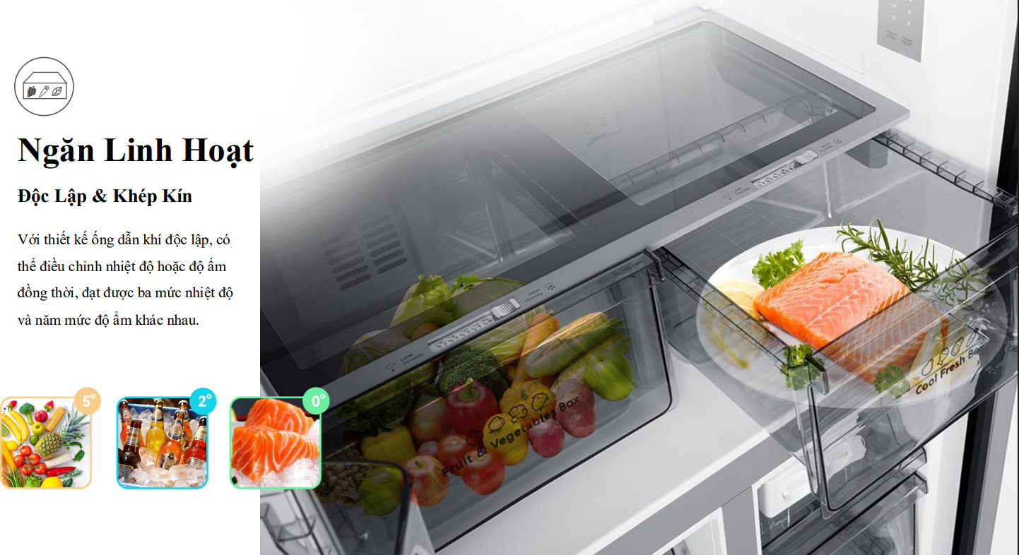 Với thiết kế ngăn kín và hệ thống dẫn khí độc lập, ngăn linh hoạt này đảm bảo thực phẩm được bảo quản đúng điều kiện nhiệt độ, hạn chế lẫn mùi và giúp người dùng chủ động trong việc dự trữ.