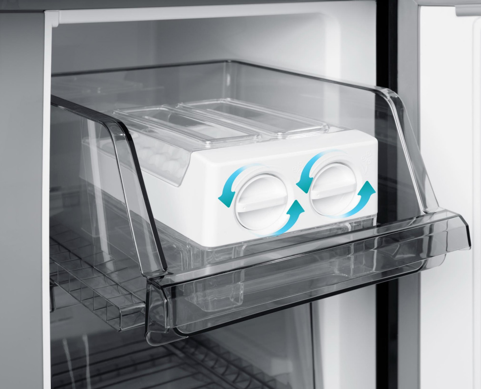 - Khay đá xoay kép: Làm đá nhanh gấp đôi, thao tác dễ dàng, có thể tháo rời để tăng không gian ngăn đông.