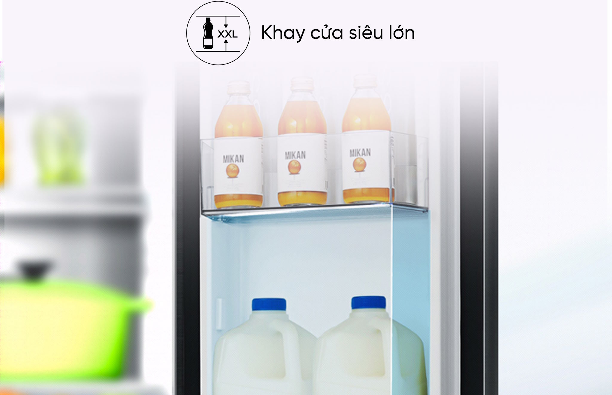 Không gian bên trong còn được tối ưu bởi khay cửa XXL rộng đến 105mm, cho phép đặt chai lọ lớn hoặc đồ cồng kềnh một cách dễ dàng, giúp việc lưu trữ tiện lợi hơn bao giờ hết.