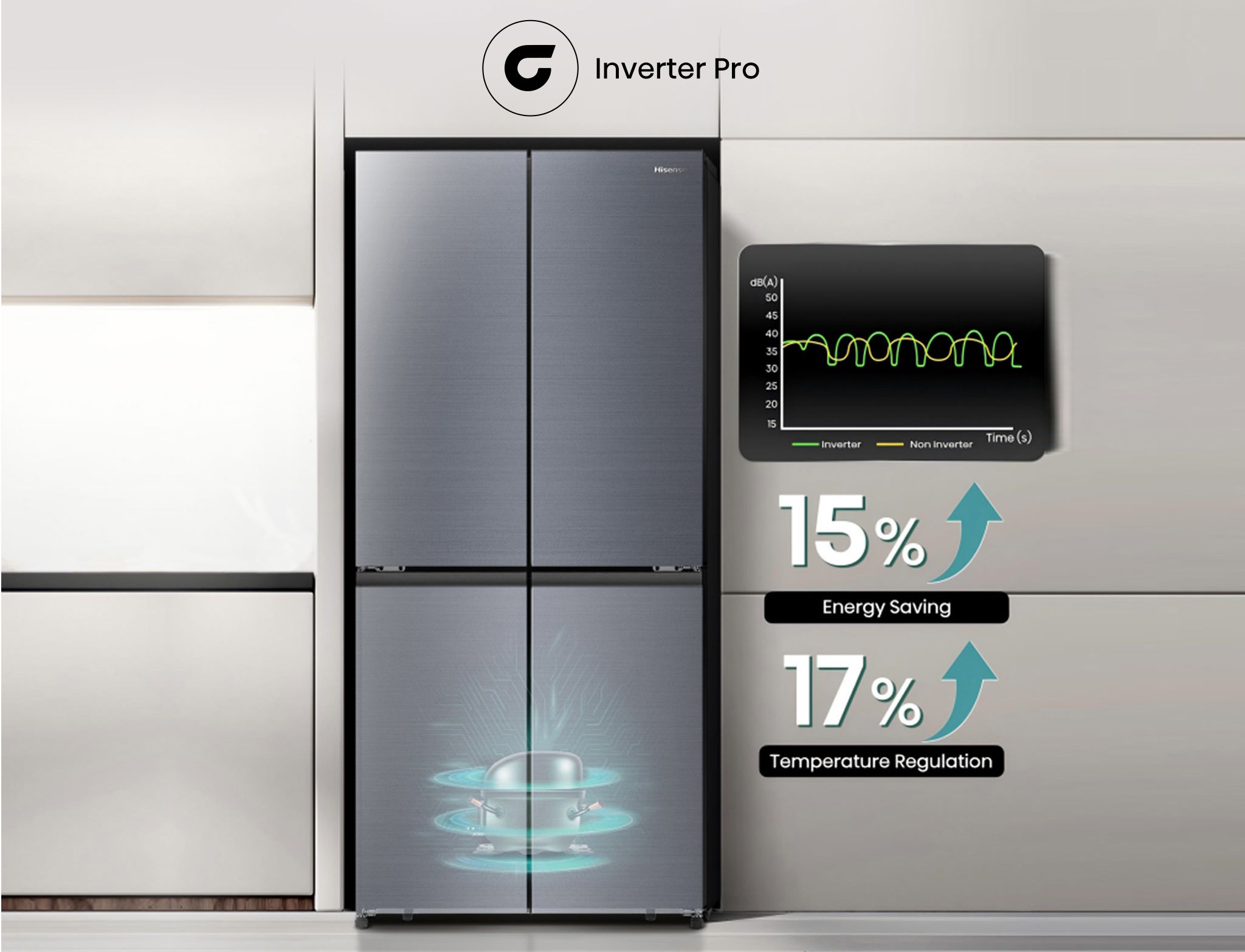 Trang bị máy nén Inverter thông minh, tủ lạnh Hisense RQ630N4EBUI3 có khả năng tự động điều chỉnh công suất làm lạnh tùy theo lượng thực phẩm và tần suất sử dụng, giúp tiết kiệm điện năng đến 40% so với tủ lạnh thông thường.