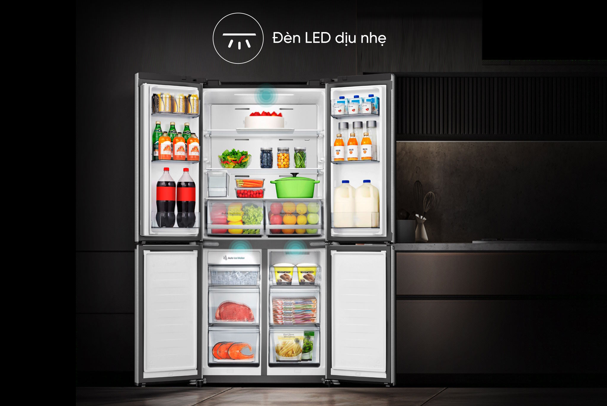 - Ngăn mát (313 lít): Lưu trữ thực phẩm tươi sống, rau củ và đồ ăn chín.