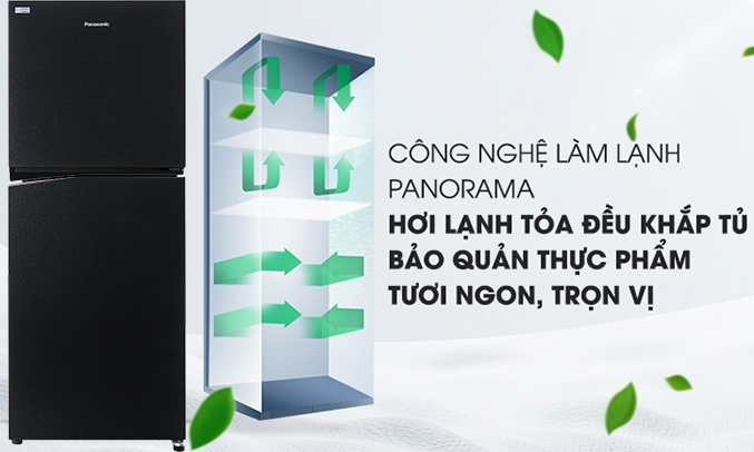 Tủ lạnh có công nghệ Panorama đưa luồng khí lạnh thổi đều các góc, ngăn chứa bên trên ngăn đông, giúp làm đông nhanh chóng, tiết kiệm điện năng.