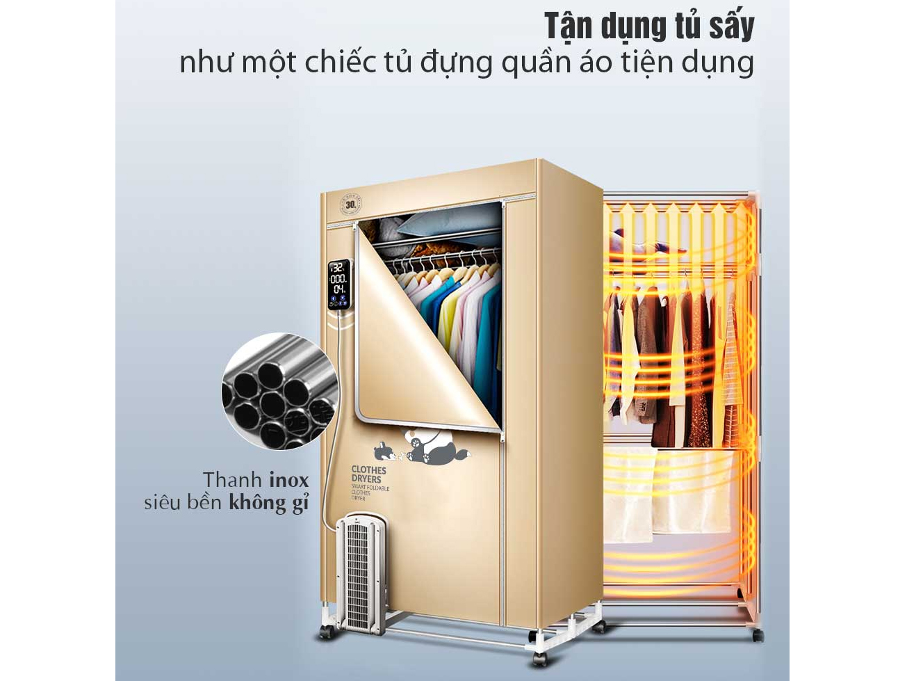 Tủ sấy quần áo Sowun SW 869S sử dụng các thanh inox làm khung cho độ bền cao, không bị gỉ sét, đồng thời dễ dàng tháo lắp nhằm tiết kiệm không gian, thuận tiện khi bảo quản, di chuyển.
